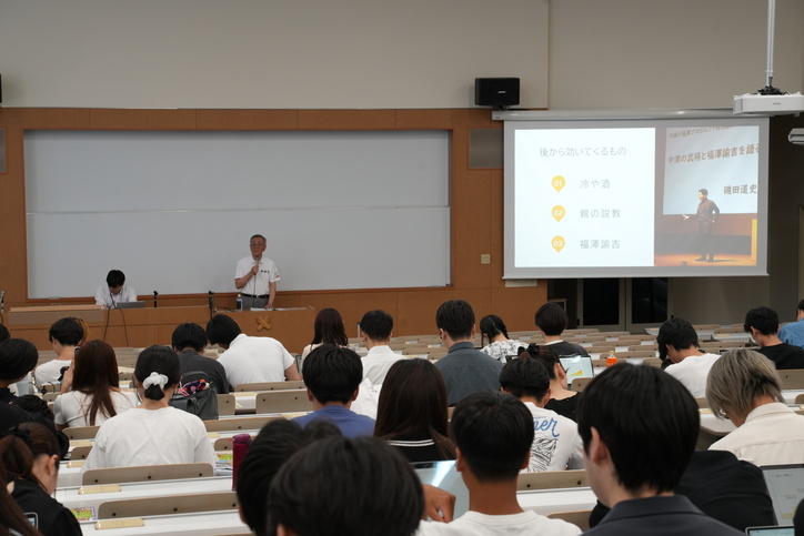 On June 30, Mayor Masanori Okuzuka of Nakatsu City, Oita Prefecture, gave a lecture in the class "Modern Japan and Fukuzawa Yukichi I," a course established by the Fukuzawa Memorial Center for Modern Japanese Studies. This course, which is offered at Hiyoshi Campus, allows students to learn from multiple perspectives how Fukuzawa Yukichi and Keio University played pivotal roles in the modernization of Japan by examining Fukuzawa's life and the history of the university.