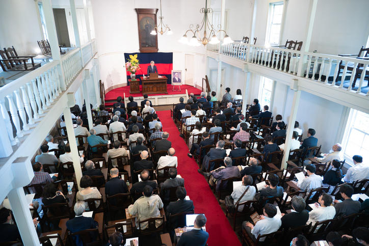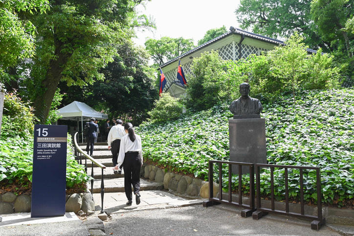 The audience members listened attentively to the entertaining lecture given by the professor, and at times, the hall was filled with laughter. After the lecture, there were many people taking photos of the Mita Public Speaking Hall, a designated Important Cultural Property of Japan. This year marks the 150th anniversary since its establishment.