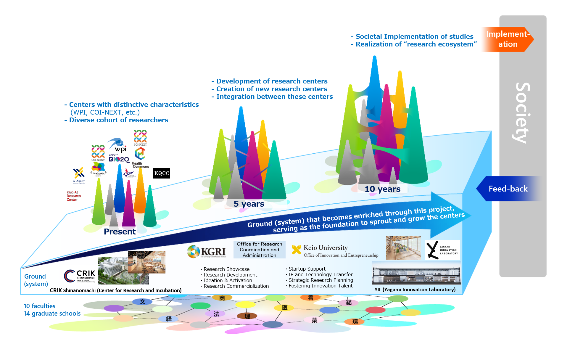 Keio engages in initiatives that stand as its pillars, one of these being the social implementation of research, which endeavor to enrich society through academic pursuits and increase the public trust in them, and another one being the creation of entrepreneurs and businesspeople that promote economic development. Through these activities, Keio strives to be a research university that has strong ties with and plays a leading role in all corners of society.