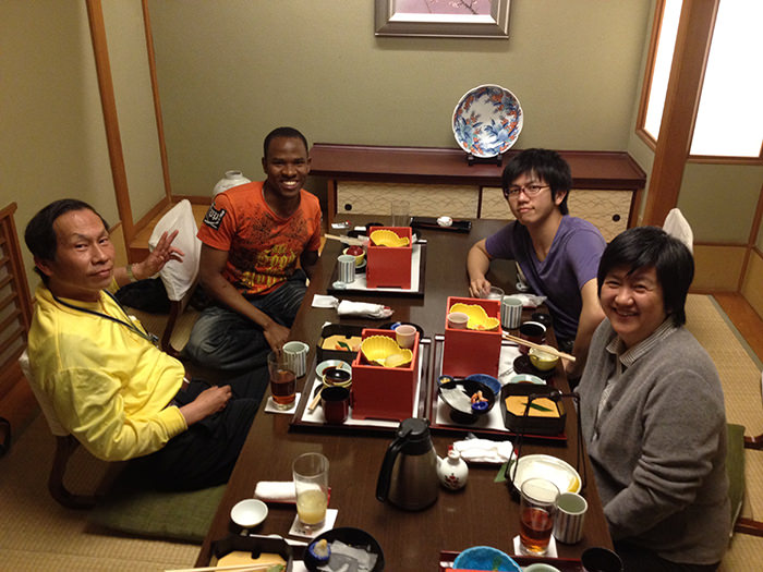 A typical weekday begins with an early rise (especially if I have a lecture first period). I start off with my personal devotions and a quick breakfast and rush down to school for first lectures by 9 a.m. It's quite convenient from the dorms, just one train station away. At lunch time, I socialize with friends at the spacious cafeteria and we go over the day's classes and practice our Japanese/English. At the day's end, we have a brief group study and deliberate over our research and assignments. This concludes with a group dinner which lasts longer on more stressful days. When I return home, I go over my remaining duties, take a jog, make plans for the next day, and have a much deserved rest. My weekends are very valuable. I spend it having a good rest, playing sports, or hanging out with friends from other institutions. When I'm not doing any of the above I take a short trip to explore the hidden wonders of Japan.