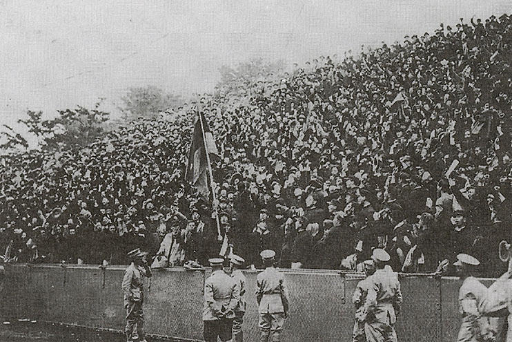 だが、その秋の慶早戦3回戦でいわゆる“リンゴ事件”が起こる。9回表の守備についた義塾・水原茂3塁手が、早稲田応援席から投げ込まれたリンゴの芯を投げ返し、しかも9回裏に義塾が逆転勝利したため、興奮した早稲田応援団の一部が試合終了後、義塾側に殺到、指揮棒を奪い去ったのである。
