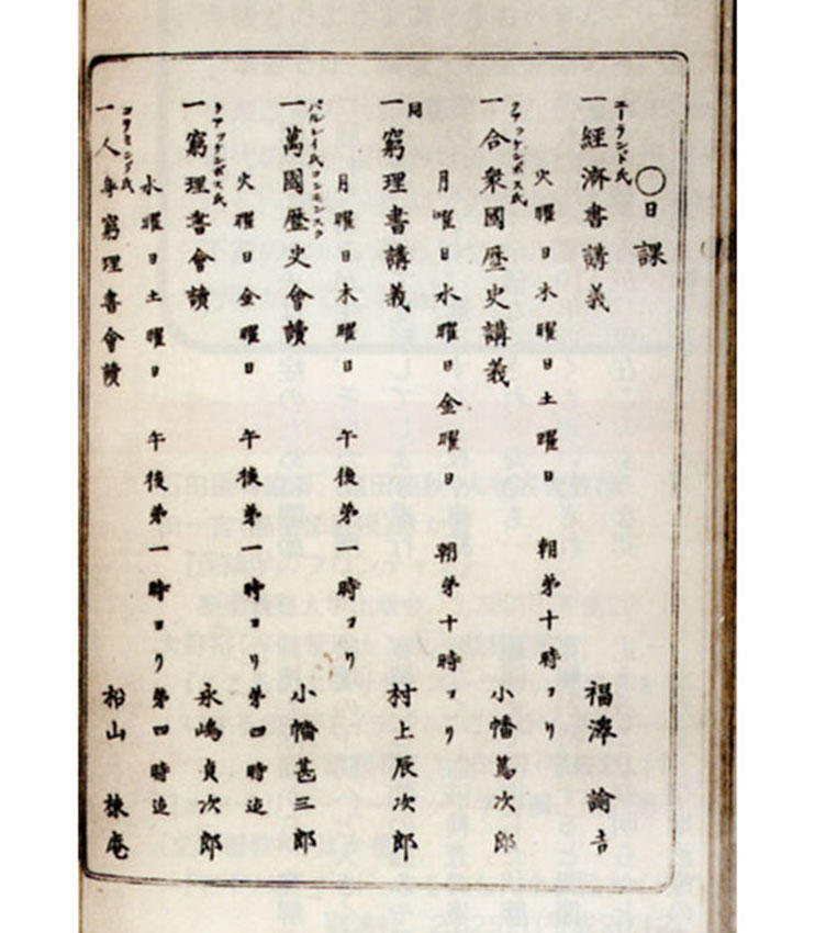 1868(慶応4)年4月、それまで福澤塾と呼ばれていた私塾は、イギリスのパブリックスクールなど西洋の「共立学校」の制度にならい、洋学を志す同志が結社を共同経営する画期的な開かれた学校となることを宣言し、慶應義塾と命名された。授業では洋風の七曜制を取り入れて日曜は休日、教科は経済、歴史、地理、窮理(物理)、算術、文典、修身論とこれも西洋式である。テキストは主に、1867(慶応3)年に福澤先生が3度目の洋行をした時に購入した英文の原書である。