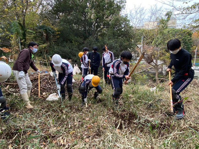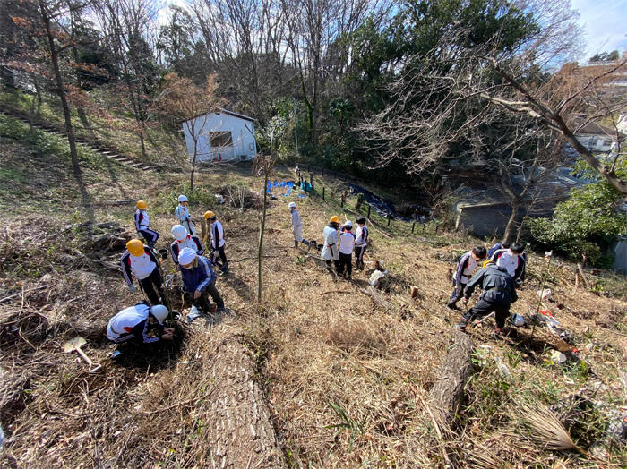選択授業である「普通部の森」の授業は2001年頃から始まっています。私は2004年に慶應義塾大学の助手(嘱託)として初めて日吉に来たのですが、その頃から、普通部の森の授業に関わっており、もう20年になります。授業内容を一言で言うならば、蝮谷の斜面林(雑木林)の自然回復作業です。つまり雑木林の下草刈り、枝打ち、あるいは枯れた木があればクヌギ、エゴノキなどを植樹するなど、雑木林の管理をしながら、自然観察をする授業で、毎週土曜日に2時間森に足を運んでいます。