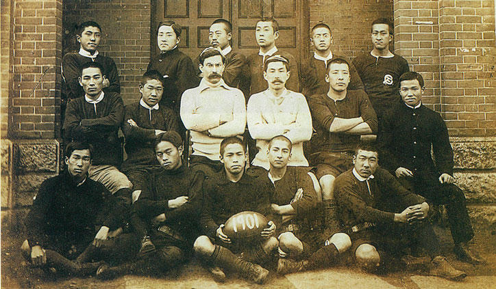 事の始まりは1899年の秋。当時、大学部理財科で英語講師を務めていた英国人のE・B・クラークは、気持ちの良い季節にもかかわらず無為に過ごしている学生を見てラグビーを教えようと思いついた。早速、自分と同じケンブリッジ大学で学んだ田中銀之助に通訳兼コーチとして協力してもらい、学生たちにラグビーを教えた。