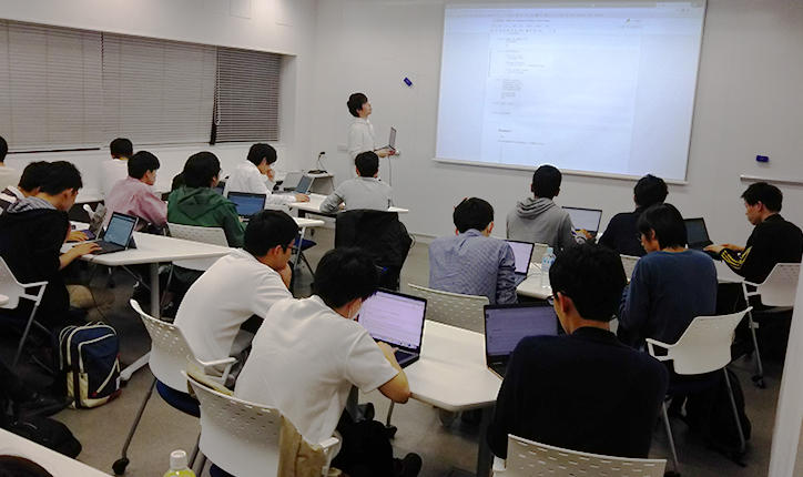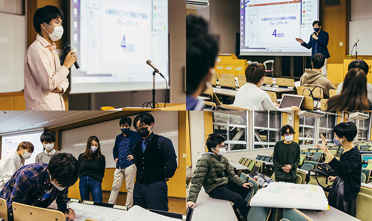 全5回の講座は、5~6人でチームを組むグループワークが中心で、最終回では各チーム対抗のビジネスコンテストを開催。様々な学部の学生たちがディスカッションを繰り返しながら、新しいビジネスアイデアをAIで具現化するためのプロセスを学びます。講座では、多様な意見から落としどころを見つけるポイント、資料作成やプレゼン時のテクニックなど、ビジネスシーンで活用できる実践的なアドバイスも充実しています。