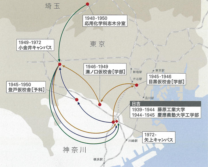 1939(昭和14)年、日吉キャンパス内に理工学部の前身となる藤原工業大学(機械工学科、電気工学科、応用化学科、および予科)創設。小泉と藤原の協議の中で、将来の慶應義塾との合併を見据えて、制服や教員人事などは慶應義塾大学と同等または共通にするように配慮された。