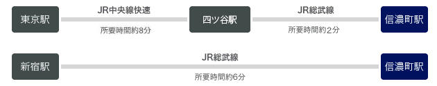 | 【1】1号館(病院、カフェ、コンビニエンスストア) | 【2】2号館(病院、レストラン、カフェ、コンビニエンスストア、慶應義塾大学信濃町リサーチ&インキュベーションセンター[通称:CRIK信濃町]) | 【3】3号館(南棟)(病院) |