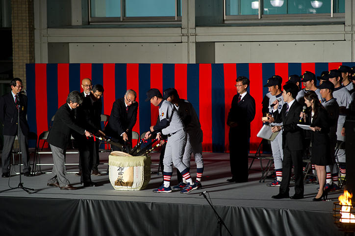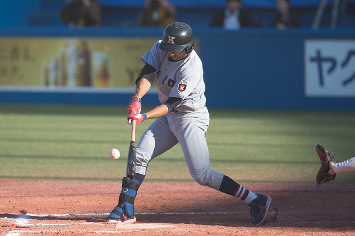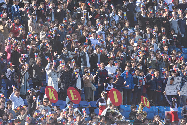 10月30日に行われた2回戦では、2回裏に1点先制し、6回表に同点に追いつかれましたが、6回裏に清水翔太君(総合政策学部4年)が2点三塁打で勝ち越し、8回裏にも打者一巡の猛攻で4点を挙げて、早稲田大学を突き放しました。また先発の佐藤宏樹君(環境情報学部1年)は8回2失点と好投。7-2で勝利し優勝しました。明治神宮球場には塾生、塾員(卒業生)をはじめ多くの観客が集まり終始熱い声援が送られ、優勝が決まった瞬間は、スタンドから大歓声が上がりました。