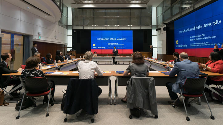 10月31日(水)、英国大学協会および英国の大学の代表者ら総勢13名が三田キャンパスを訪れました。小尾晋之介国際センター所長による慶應義塾の国際展開についてのプレゼンテーションに続き、國領二郎常任理事の司会によるQ&Aセッションを実施し、日英両国の大学の教育・研究の促進について、活発な議論が交わされました。また、慶應義塾大学が2020年に英国代表チームの事前キャンプを受け入れることを踏まえ、オリンピック・パラリンピックに大学がどのように貢献できるかについての意見交換を行いました。
