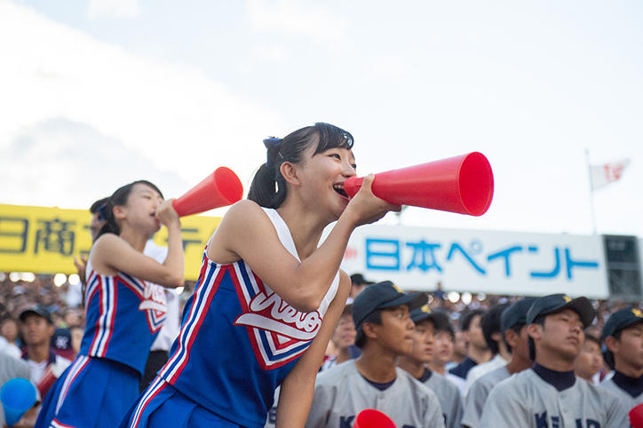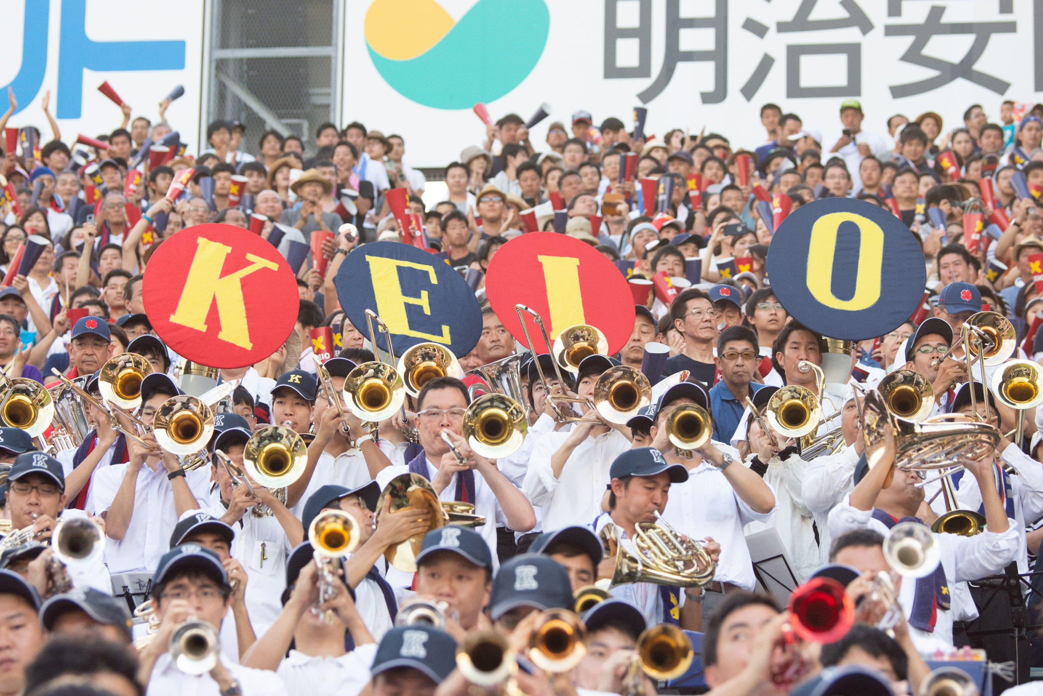 満員となった1塁側アルプススタンドの応援席では、幼稚舎から大学までの在校生・卒業生・教職員などが一丸となって大声援を送り、得点時には「若き血」の大合唱が甲子園を轟かせました。10年ぶり18回目の出場となった記念すべき夏の第100回記念大会で、最後まで諦めることなく清々しい闘いを見せた選手たちの健闘を称え、応援スタンドからは惜しみない大きな拍手が送られました。
