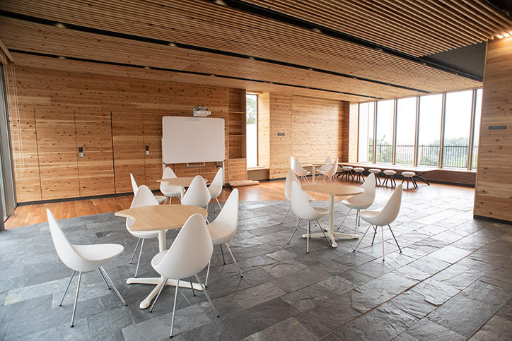 日吉協育棟は、12万冊の蔵書を誇る図書室を中心として構成され、寄贈図書を自由に利用できるビブリオラウンジを含む3つのラウンジと、高等学校ゆかりの資料が展示されるアーカイブのスペースのほか、トレーニングルーム、和室、ホールなどが設けられています。1934年竣工の第一校舎とも調和するように設計された日吉協育棟は、内装の一部に慶應義塾の学校林である宮城県南三陸志津川の森の杉が使われており、また、各所に設けられた大きな窓からは、日吉の森の広大なパノラマを一望することができます。