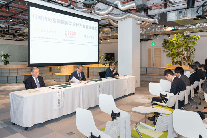 11月1日(金)、慶應義塾大学殿町タウンキャンパスを擁する殿町キングスカイフロント(川崎市川崎区)にて、慶應義塾大学(殿町先端研究教育連携スクエア)・川崎市産業振興財団・横浜銀行の三者による「川崎市の産業振興に向けた覚書」締結式が行われ、殿町先端研究連携スクエア長の青山藤詞郎常任理事が出席しました。