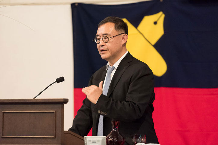 今年は、5月15日(水)、三田演説館にて、竹森俊平経済学部教授により、「グローバル化とポピュリズム政治」という演題で講演会が行われました。竹森教授は、グローバル化、エリート、ナショナリズムの3つの要素に焦点を当て、世相が大きく変わる1860年代から現代に至るまでのポピュリズム政治の流れを考察しました。