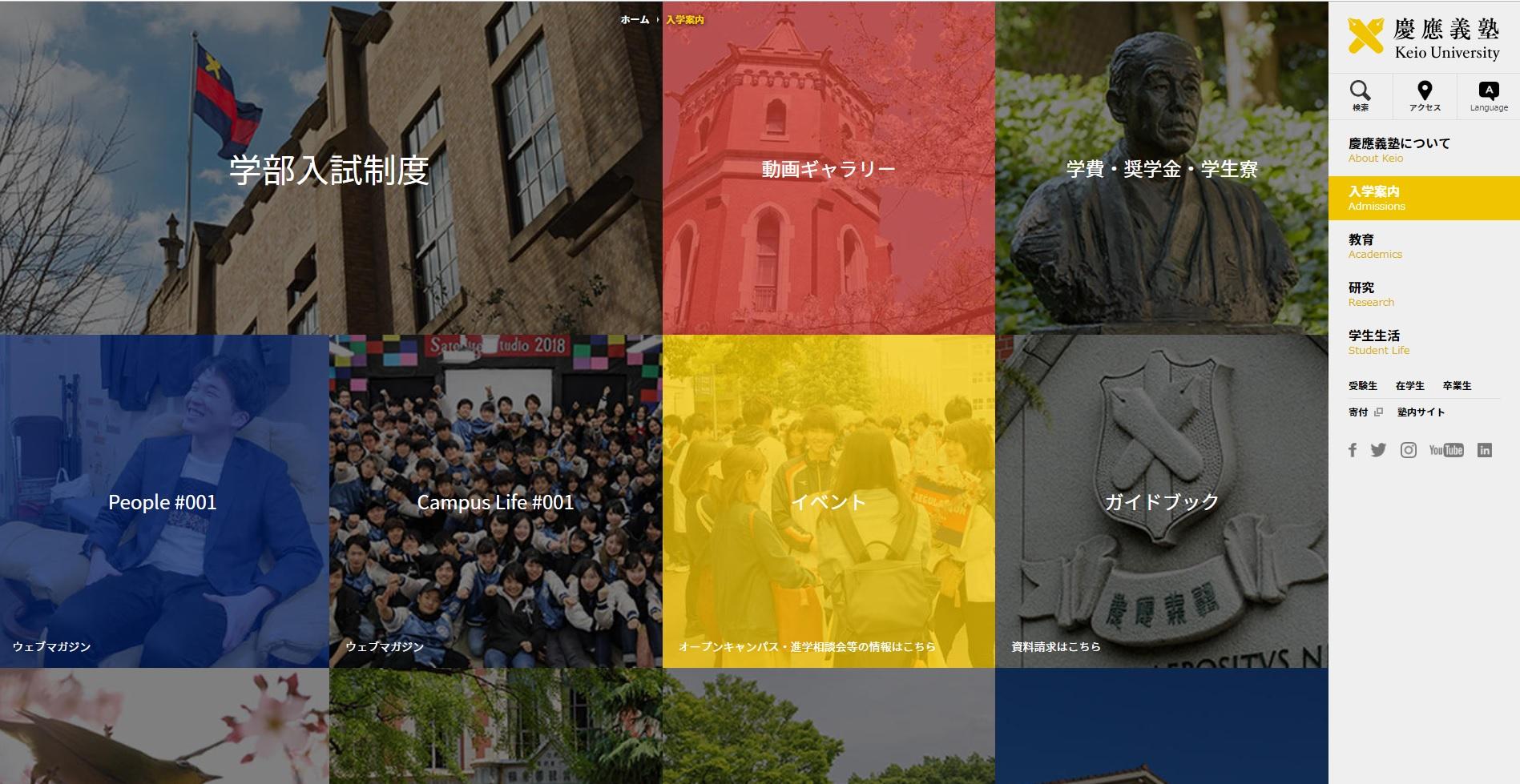 2019年5月22日、慶應義塾公式ウェブサイトの「入学案内」ページをリニューアルしました。今回のリニューアルに伴い、今まで別サイトだった高校生・受験生向けのウェブサイト「学部入学案内サイト」を入学案内ページに統合したことで、学部入試に関する情報が1か所に集約され、慶應義塾ウェブサイト内の他のコンテンツへのアクセスも容易になるなど、利便性が大きく向上しています。