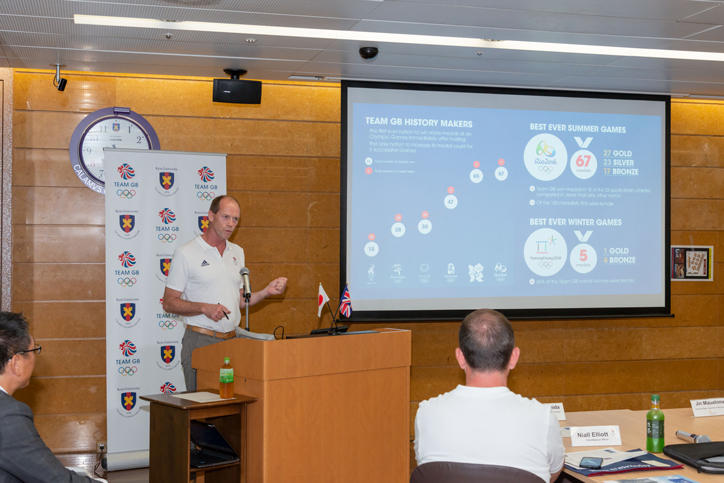 病院の見学後、総合医科学研究棟1階ラウンジにおいて、医学部との合同セミナーが開催されました。スポーツ医学研究センターの石田浩之教授の司会のもと、天谷雅行医学部長が医学部・病院の紹介を行い、英国代表チームパフォーマンスサービス責任者のグレッグ・レッター氏が英国代表チームのオリンピックへ向けた準備状況についての講演を行いました。続いて、英国代表チームの医療チーフであるニール・エリオット医師と慶應義塾大学精神・神経科の水島仁医師により、スポーツにおける脳震盪に関連した診断や管理、症例の研究などについての講演が行われました。セミナー後にはオリンピックを見据えた講演の内容についてBOA、BPAおよび医学部の教員、学生等の参加者による活発なディスカッションが行われました。