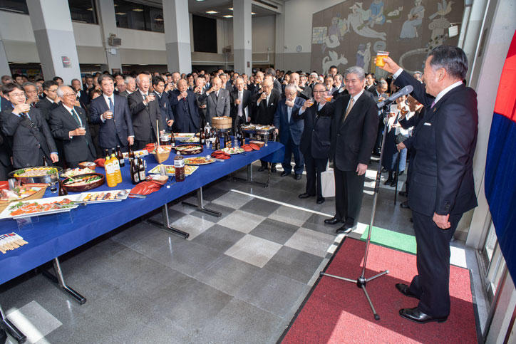 式典終了後は、会場を学生食堂ホールに移して「新年名刺交換会」が行われました。今年も三田の山には多くの塾生、塾員、教職員が集い、福澤先生に思いをはせるとともに、賑やかに新年の挨拶が交わされました。