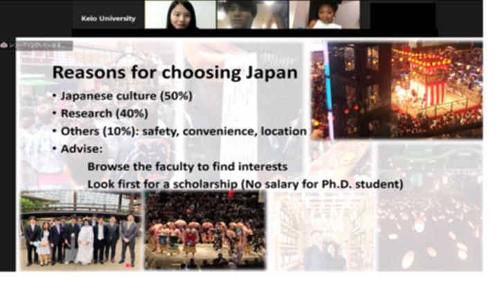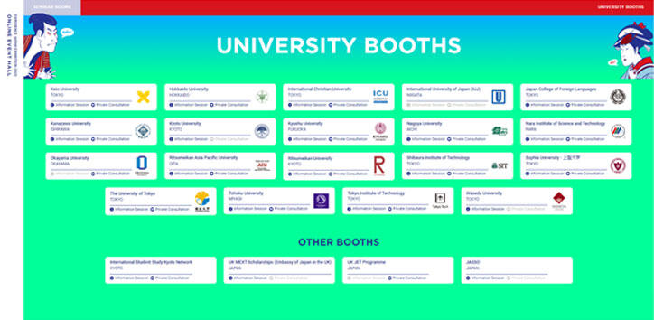 当日は、慶應義塾大学を含む日本の大学、日本語学校および在英日本大使館など約20機関がそれぞれバーチャルブースに出展し、各大学独自の留学プログラムに関する説明会や、来場者との個別相談を行いました。並行して、オンライン上のイベントホールでは、日本留学の基礎知識、現役の学生による日本留学体験談、JSPSの研究助成プログラム、JASSOの奨学金情報、日本での就職機会などを紹介するセミナーなどが実施されました。どのセミナーも、来場者からの質問が尽きず、時間が足りないという声が数多く聞かれるほど盛況でした。