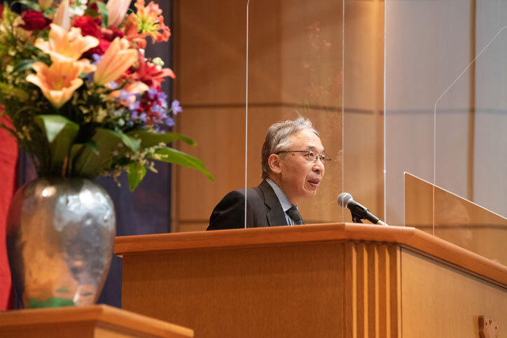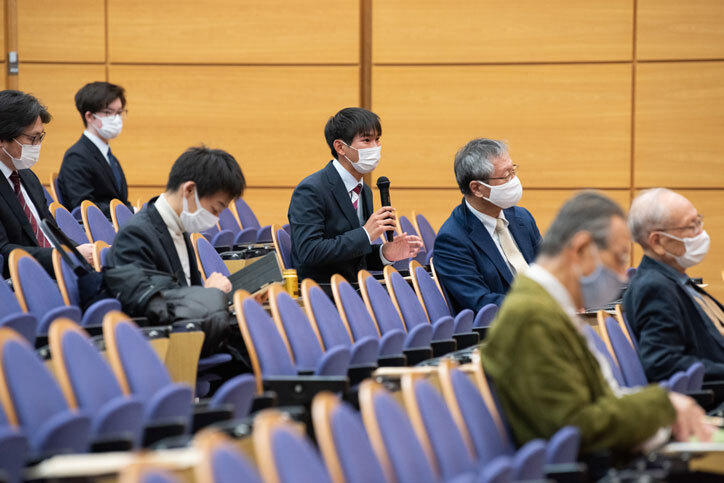 例年は三田演説館を会場にしていますが、新型コロナウイルス感染症対策のため、西校舎ホールにて、距離を取って着席する形式で実施、聴講者は講演に熱心に耳を傾けていました。