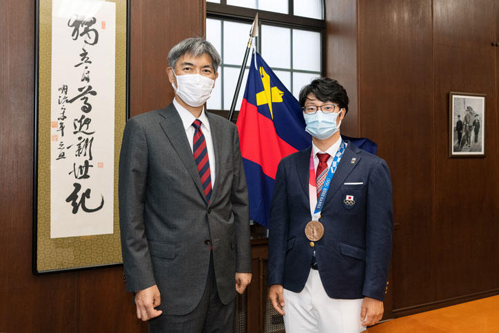 東京2020オリンピック・アーチェリー男子団体で銅メダルを獲得した武藤弘樹君(環境情報学部卒業、体育会洋弓部出身)が、8月20日(金)に伊藤公平塾長を表敬訪問しました。