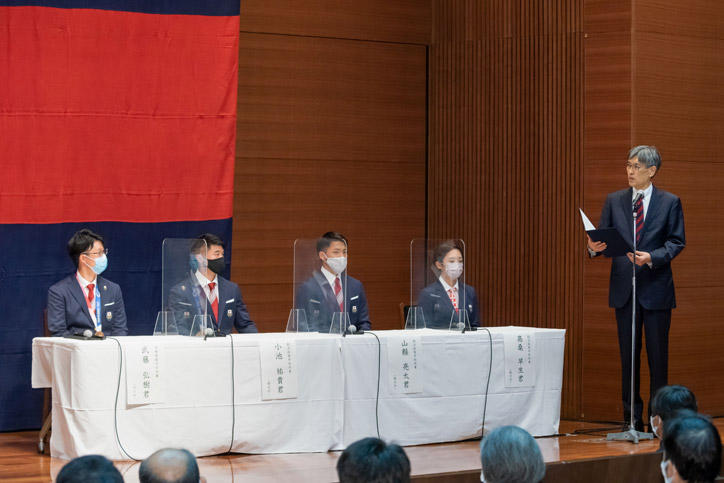 今夏に開催された東京2020オリンピックおよびパラリンピックには、慶應義塾大学の塾生(学生)、塾員(卒業生)が計10名出場し、それぞれの種目で活躍しました。各選手の健闘をたたえるために、9月28日(火)、三田キャンパス南校舎ホールにて「東京2020オリンピック・パラリンピック出場選手塾長招待会」が開催されました。本会は、新型コロナウイルスの感染拡大防止に最大限配慮するため、参加者を選手と一部の関係者に限り、インターネットでのライブ配信を行いました。