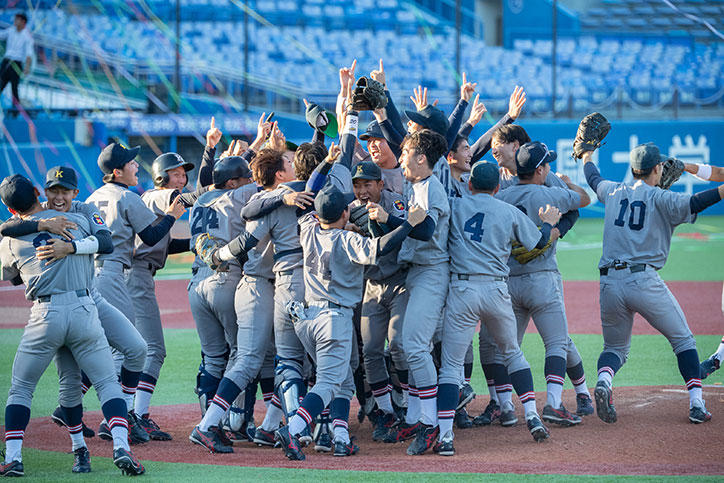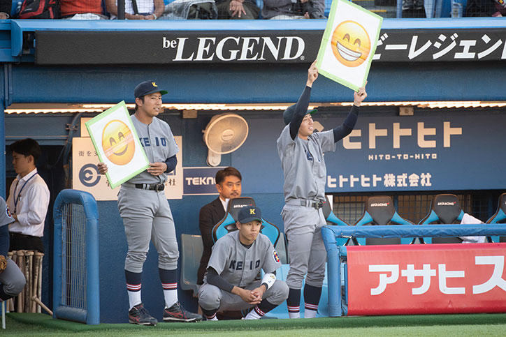 今季は、栗林泰三君(環境情報学部4年・外野手)が三冠王を獲得し、さらに栗林君と外丸東眞君(環境情報学部2年・投手)と宮崎恭輔君(環境情報学部4年・捕手 )の3名がベストナインに選ばれ、輝かしい記録を残しました。
