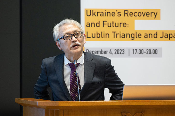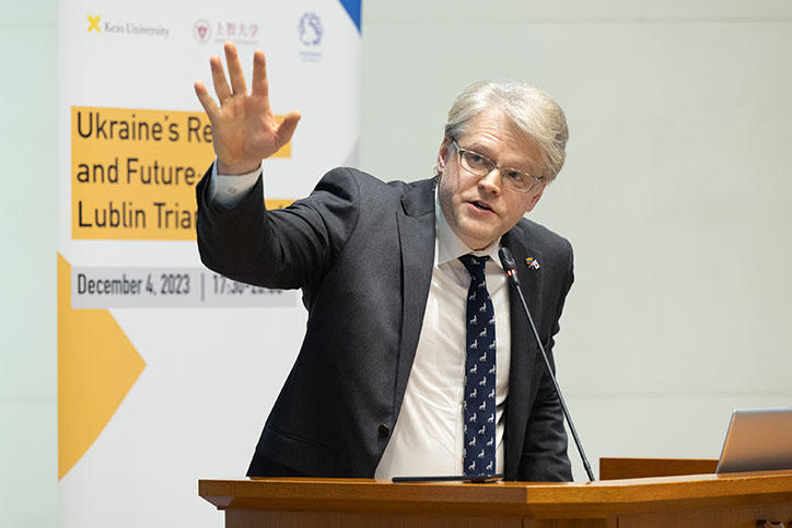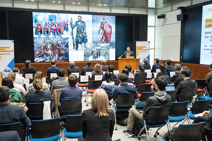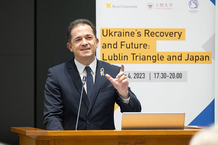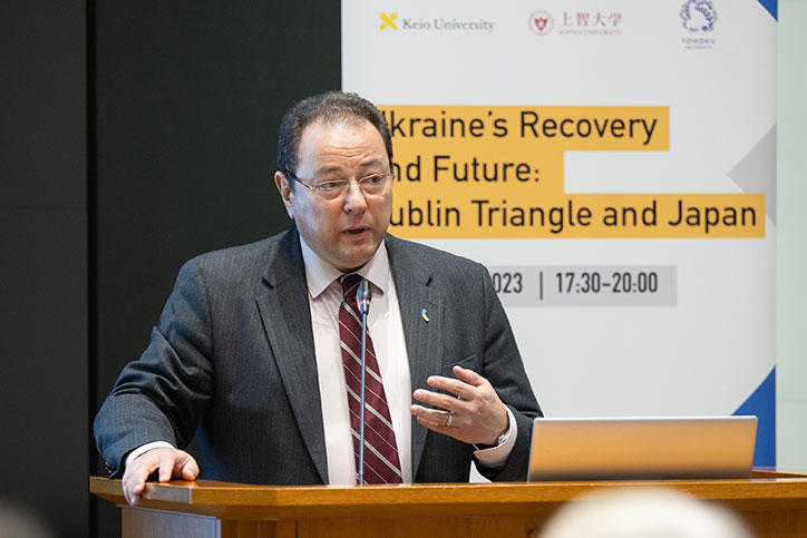今回のワークショップは土屋大洋慶應義塾常任理事の司会で進行。伊藤公平慶應義塾長による開会の辞に続く基調講演では、駐日ウクライナ特命全権大使であるセルギー・コルスンスキー氏が登壇し、「ウクライナの再構築と復興」について熱心に語りました。コルスンスキー氏は、ルブリン・トライアングルが協力関係にある歴史的背景の説明とともに、ウクライナが直面している課題と、国際社会が協力して支援する必要性を訴えました。