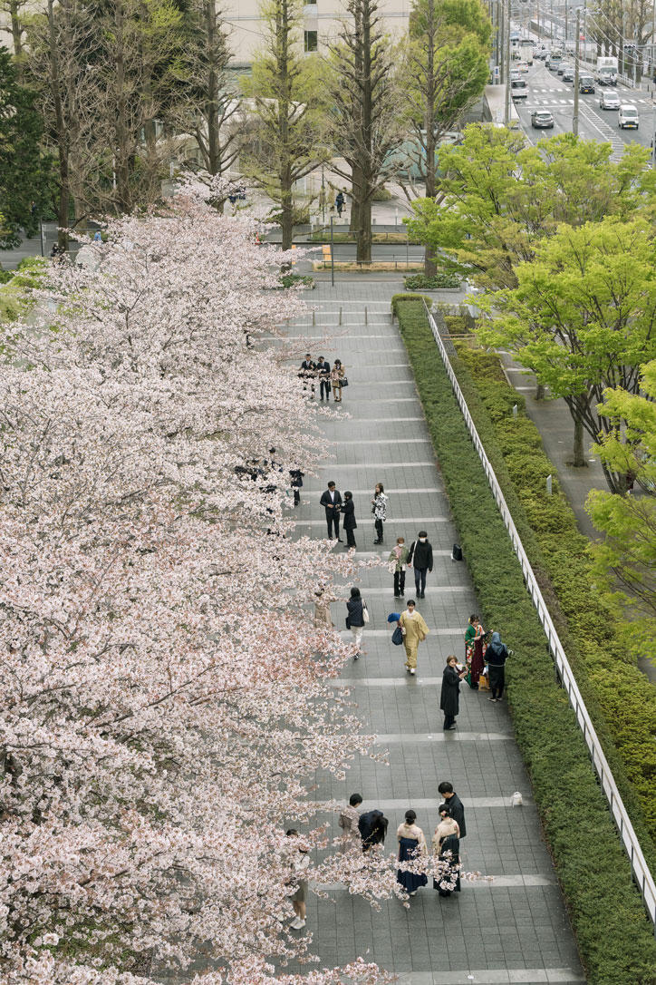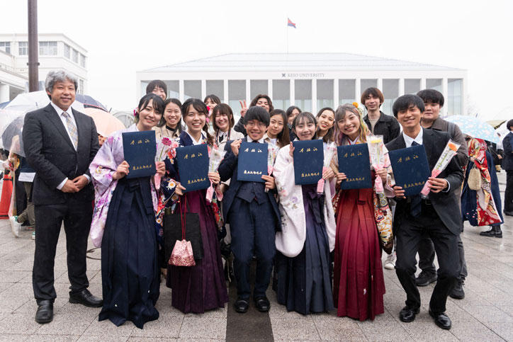 両日とも桜雨の下、日吉キャンパスには多くの卒業生・修了生たちの笑顔が咲きました。