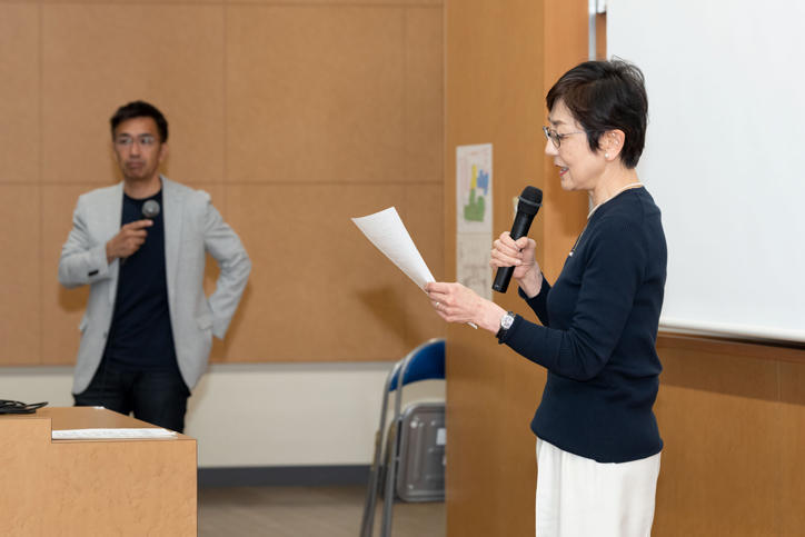 第2回の5月24日(水)にはイントロダクションが行われ、80名ほどが参加しました。前年度の分科会リーダー4名からの提言作成に向けたアドバイスに始まり、蟹江憲史 政策・メディア研究科教授による講演、続いて蟹江教授と国谷裕子 政策・メディア研究科特別招聘教授との対談が行われました。対談ではそれぞれが考える「SDGsの意義」を語り、塾生には「思い切って行動し、思い切り失敗してみてほしい」、そして「革新的な発想を持って、世界を導いてほしい」と思いを伝えました。