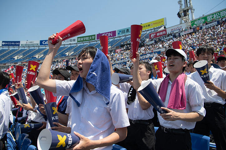 3回表に2点先制した慶應義塾高校は、5回裏に1点差に追い上げられ、6回表に追加点をあげますが、6回裏に3失点を喫し逆転を許しました。7回裏にも追加点を許し3対5のまま迎えた9回表、渡邉千之亮君による劇的な3ランホームランで逆転。投げては先発小宅君から鈴木君、松井君への継投で横浜高校打線を抑え、ピンチの場面でも笑顔のエンジョイ・ベースボールで見事勝利をつかみました。スタジアムでは、記録的な猛暑のなか野球部員や在校生、卒業生をはじめとする多くの観客が声援を送り、野球部の勝利と、今春のセンバツに続く甲子園出場の喜びを分かち合いました。夏の甲子園でセンバツでの雪辱を果たす活躍が期待されます。