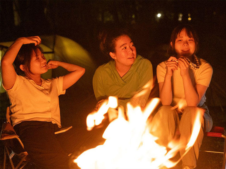 参加者の相互理解や各自の目標の共有、テント設営など、キャンプ実施に必要な知識や技能を身につけるための事前ワークショップを7月8日(土)に横浜初等部で実施した上で当日を迎えました。キャンプには横浜初等部から19名、湘南藤沢中・高等部から6名、大学院システムデザイン・マネジメント研究科(SDM研究科)から5名(うち留学生2名)、そして、海外の大学からの留学生3名、大学公認団体「ローバースカウト」の学生3名の計36名の学生が参加し、それぞれの組織の教職員も含めた約50名でさまざまな取り組みを実施しました。