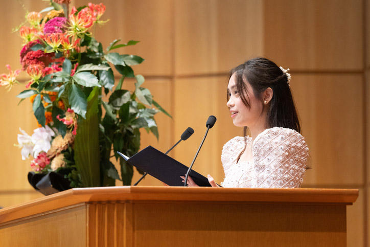 続く伊藤塾長の式辞では、分断が進んだ今の社会において、卒業生全員が環境保全と社会の健全な発展のために分断の橋渡し役を果たすことを信じていると伝えました。その後、砂原秀樹メディアデザイン研究科教授による教職員代表祝辞、また卒業生を代表して環境情報学部のカガリンガン リアン ビアンカ君が答辞を述べました。最後は塾歌斉唱により締めくくられました。