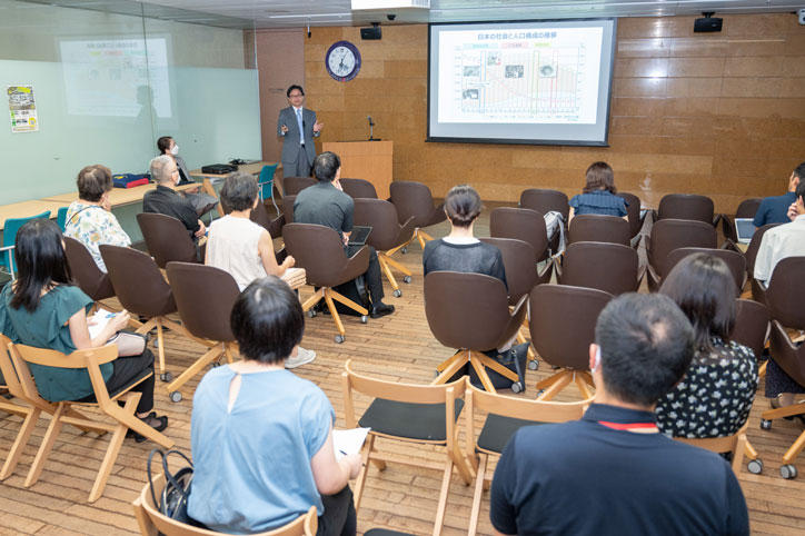 講演では、アカデミアと企業のサイエンスナレッジ・データ基盤を活用して展開される異分野融合研究や、そこで創出される様々なセンシング技術やAI解析によるアルゴリズムなどについて紹介がありました。医療・介護・ヘルスケアをシームレスに結び、治療後の悩みを抱える個人・家族が必要な時に適切なところに繋がること。そして、繋がることで、見守られ、安心と生きがいを持って、自身の生活を豊かに暮らせるヘルスコモンズ共生社会の実現を目指したいという中村教授の講演を、参加者は皆熱心に聴講し、活発な質疑応答が行われました。