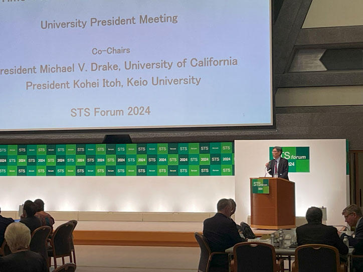“Information Overload?: The Impact of Real-Time Technologies on Higher Education”をテーマに、共同議長役の伊藤塾長、カリフォルニア大学(米国)ドレイク学長を含めた4名の学長による発表後、全参加者によるグループディスカッションが行われ、加速するAIや新しいテクノロジーに対する大学長としての対応や考え方について活発な議論が行われました。伊藤塾長は主要プログラムであり、本フォーラム創設者の尾身幸次氏の貢献を称えるセッションである “Koji Omi Memorial Plenary: Lights and Shadows of AI”にも議長として登壇しました。