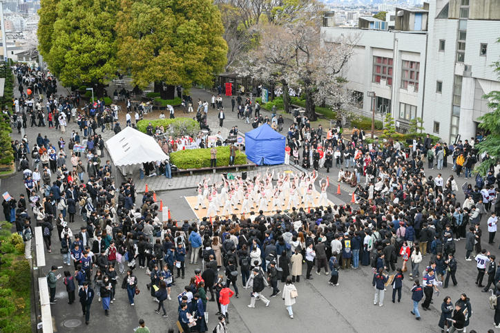 オリエンテーション期間の日吉キャンパスでは、さまざまな学生団体による新入生の勧誘やステージイベントが行われています。あいにくの天気が続いていますが、満開の桜の下、日吉キャンパスは、多くの新入生らで賑わいをみせ、活気に満ちています。(撮影日:2025年4月2日)