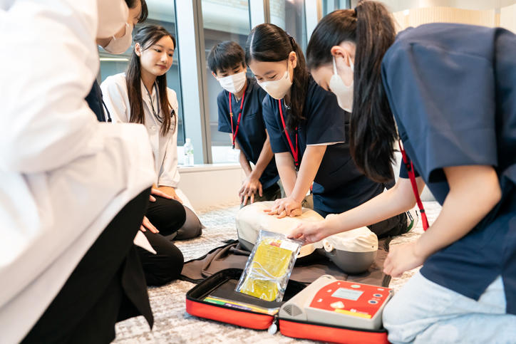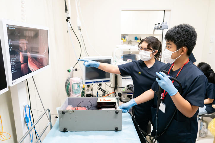 参加者は3つのグループに分かれ、予防医療センターの医療スタッフ用ユニフォームを着用して、医師・看護師・技師と、医学部・看護医療学部・薬学部生の救命救急措置法普及活動サークル「KAPPA (Keio ACLS Popularizing and Promoting Association)」所属学生の指導で、内視鏡検査、超音波検査、一次救命処置の3種類を、ローテーションしながら体験していきました。内視鏡検査では医師のトレーニング用臓器モデルを用いて食道から十二指腸までのスコープでの観察技術、超音波検査では上腹部の臓器を模したシミュレーターで内蔵の様子を見分ける方法、一次救命処置では正しい胸骨圧迫の技術とAED(自動体外式除細動器)の使い方を学びました。ワークショップ開始前の説明を聞いているときは緊張した面持ちだった参加者たちも、セッションが進むにつれて医師や医学生と打ち解けた様子で談笑したり、熱心に質問したりして、とても楽しそうに学びを深めていました。