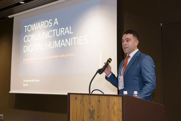 Marcus Gilroy-Ware博士による講演では、新技術が社会的発展をもたらす一方で、一部の巨大IT企業への権力集中、サイバー攻撃をはじめとする地政学的リスク、環境負荷などが生じている今日のデジタル社会の功罪が取り上げられ、デジタル・ヒューマニティーズが今後の世界において果たすべき役割について考察がなされました。続いて、永崎研宣文学部教授および国際デジタル・ヒューマニティーズ連合(ADHO)の会長を務めるリッチモンド大学のLauren Tilton教授より、日本デジタル・ヒューマニティーズ学会(JADH)、ADHO、ACHなどに代表される日本および世界のDHコミュニティのネットワークに関する最新動向が紹介されました。