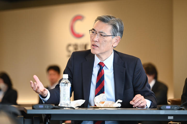 まず、伊藤公平塾長より、慶應義塾大学病院が2018年に採択された内閣府戦略的イノベーション創造プログラム「AIホスピタルによる高度診断・治療システム」の取り組みから、「AI-Native University(AIキャンパス構想)」の実現を目指し、現在本学が推進している教育、研究、社会実装、倫理など幅広い施策(OpenAI社との包括連携覚書(MoU)締結など)にいたるまで、全塾をあげて展開している様々なAIプロジェクトが紹介されました。そして、多様な学問領域の学生たちがAIを自在に扱える教育体制の確立、最先端の研究設備やデジタル環境を基盤にした学際的研究の可能性、その成果を通じた社会課題の解決をめぐって、スキッパー博士と意見交換を行いました。